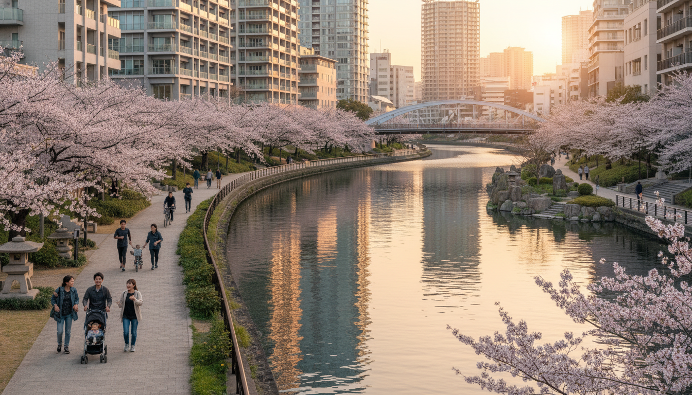 佃の最大の魅力は、都心でありながら水辺の開放感を日常的に感じられることです。隅田川テラスや石川島公園など、散歩やジョギングに最適な環境が整っています。春には花見スポットとしても知られ、子どもを連れた家族連れで賑わいます。